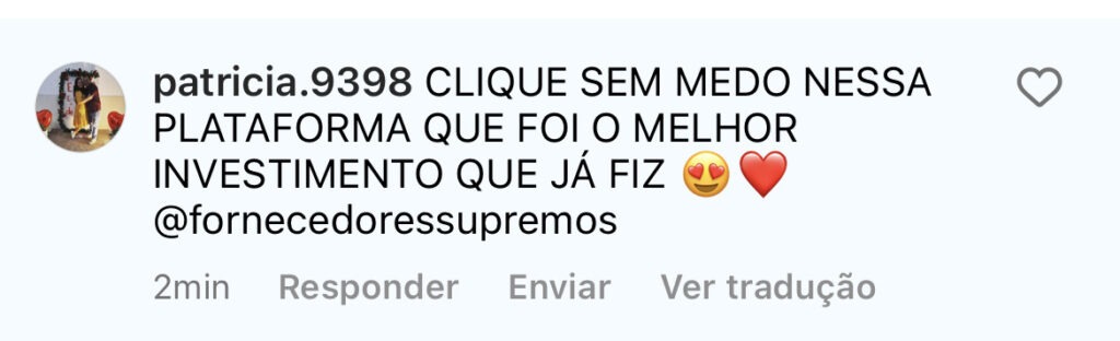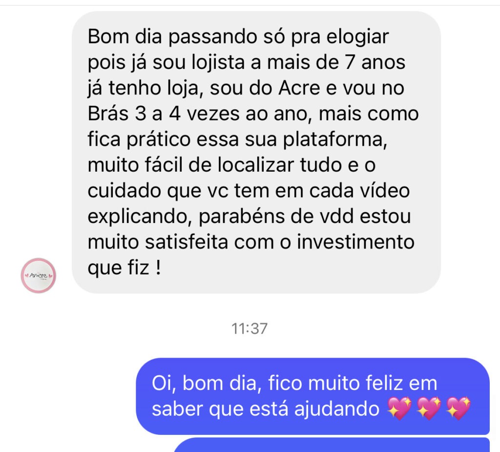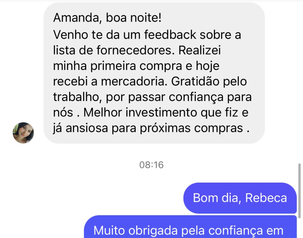 Para ter a certeza de que os fornecedores da Plataforma são 100% confiáveis, eu fui pessoalmente em cada um deles. Também analisei o perfil do Instagram de cada fornecedor e tenho certeza de que você não cairá em golpes. Quanto a isso, você pode ficar tranquila, pois adquirindo a plataforma você estará eliminando em 100% o risco de cair em golpes.